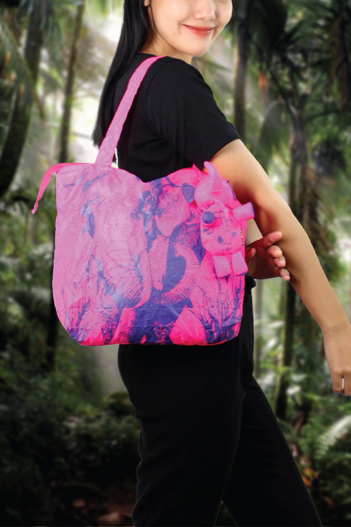 - Tote bag is easily folded up and stored into a unique Elephant doll.