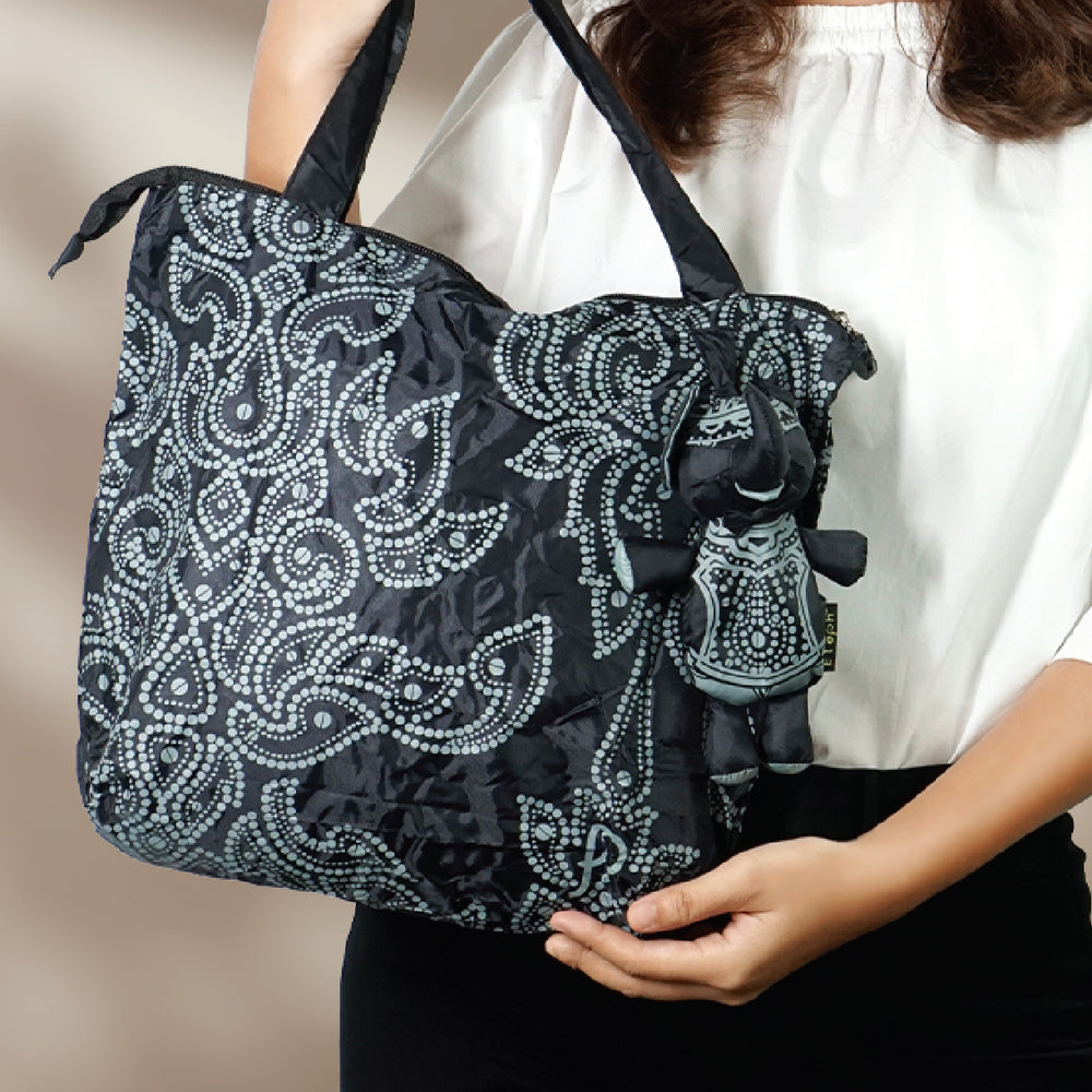 - Tote bag is easily folded up and stored into a unique Elephant doll.